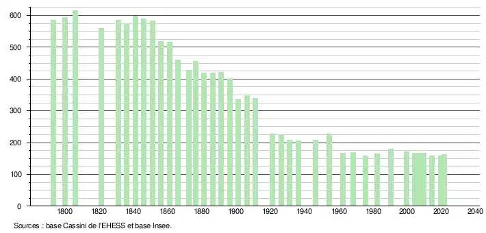 L'évolution du nombre d'habitants est connue à travers les recensements de la population effectués dans la commune depuis 1793. Pour les communes de moins de 10 000 habitants, une enquête de recensement portant sur toute la population est réalisée tous les cinq ans, les populations légales des années intermédiaires étant quant à elles estimées par interpolation ou extrapolation[20]. Pour la commune, le premier recensement exhaustif entrant dans le cadre du nouveau dispositif a été réalisé en 2004[21].