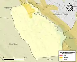 Le retrait-gonflement des sols argileux est susceptible d'engendrer des dommages importants aux bâtiments en cas d’alternance de périodes de sécheresse et de pluie[29]. 5,2 % de la superficie communale est en aléa moyen ou fort (59 % au niveau départemental et 48,5 % au niveau national)[Carte 3]. Depuis le , en application de la loi ELAN, différentes contraintes s'imposent aux vendeurs, maîtres d'ouvrages ou constructeurs de biens situés dans une zone classée en aléa moyen ou fort[Note 6],[30].