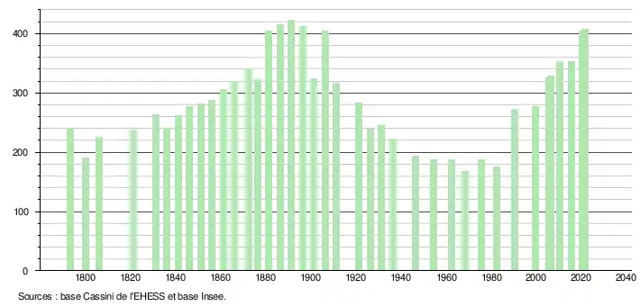 L'évolution du nombre d'habitants est connue à travers les recensements de la population effectués dans la commune depuis 1793. Pour les communes de moins de 10 000 habitants, une enquête de recensement portant sur toute la population est réalisée tous les cinq ans, les populations légales des années intermédiaires étant quant à elles estimées par interpolation ou extrapolation[37]. Pour la commune, le premier recensement exhaustif entrant dans le cadre du nouveau dispositif a été réalisé en 2005[38].