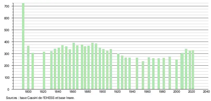 L'évolution du nombre d'habitants est connue à travers les recensements de la population effectués dans la commune depuis 1793. Pour les communes de moins de 10 000 habitants, une enquête de recensement portant sur toute la population est réalisée tous les cinq ans, les populations légales des années intermédiaires étant quant à elles estimées par interpolation ou extrapolation[23]. Pour la commune, le premier recensement exhaustif entrant dans le cadre du nouveau dispositif a été réalisé en 2007[24].