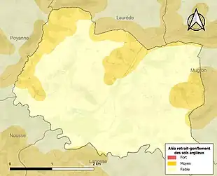 Le retrait-gonflement des sols argileux est susceptible d'engendrer des dommages importants aux bâtiments en cas d’alternance de périodes de sécheresse et de pluie. 25 % de la superficie communale est en aléa moyen ou fort (19,2 % au niveau départemental et 48,5 % au niveau national). Sur les 91 bâtiments dénombrés sur la commune en 2019, 15 sont en aléa moyen ou fort, soit 16 %, à comparer aux 17 % au niveau départemental et 54 % au niveau national. Une cartographie de l'exposition du territoire national au retrait gonflement des sols argileux est disponible sur le site du BRGM[20],[Carte 2].