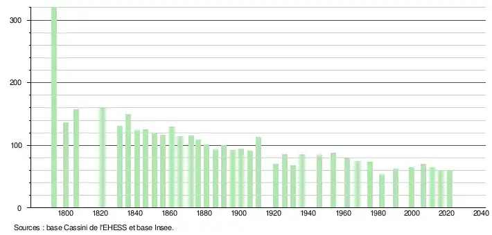 L'évolution du nombre d'habitants est connue à travers les recensements de la population effectués dans la commune depuis 1793. Pour les communes de moins de 10 000 habitants, une enquête de recensement portant sur toute la population est réalisée tous les cinq ans, les populations légales des années intermédiaires étant quant à elles estimées par interpolation ou extrapolation[20]. Pour la commune, le premier recensement exhaustif entrant dans le cadre du nouveau dispositif a été réalisé en 2006[21].