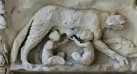 Selon le mythe rapporté par Tite-Live et Denys d'Halicarnasse, la vestale Rhéa Silvia s'est unie au dieu Mars et a donné naissance à des jumeaux, Romulus et Remus. Le roi Numitor, grand-père des jumeaux, est renversé par son frère Amulius à Albe la Longue. Pour éviter que les petits-enfants, devenus adultes, puissent revendiquer le trône usurpé, Amulius ordonne qu'ils soient jetés dans le Tibre dans un panier. Les jumeaux sont recueillis par une louve au pied du mont Palatin, sous un figuier sauvage (le Ficus Ruminalis) situé devant l'entrée de la grotte du Lupercal. L'animal les aurait nourris et protégés jusqu'à ce qu'un berger, Faustulus, les trouve et les élève. Devenus adultes, les deux frères retournent à l'endroit de leur abandon et y fondent la ville de Rome[2],[3].