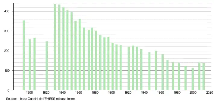 L'évolution du nombre d'habitants est connue à travers les recensements de la population effectués dans la commune depuis 1793. À partir du , les populations légales des communes sont publiées annuellement dans le cadre d'un recensement qui repose désormais sur une collecte d'information annuelle, concernant successivement tous les territoires communaux au cours d'une période de cinq ans. Pour les communes de moins de 10 000 habitants, une enquête de recensement portant sur toute la population est réalisée tous les cinq ans, les populations légales des années intermédiaires étant quant à elles estimées par interpolation ou extrapolation[3]. Pour la commune, le premier recensement exhaustif entrant dans le cadre du nouveau dispositif a été réalisé en 2007[4],[Note 1].