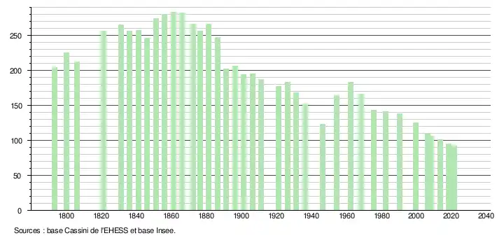 L'évolution du nombre d'habitants est connue à travers les recensements de la population effectués dans la commune depuis 1793. Pour les communes de moins de 10 000 habitants, une enquête de recensement portant sur toute la population est réalisée tous les cinq ans, les populations légales des années intermédiaires étant quant à elles estimées par interpolation ou extrapolation[15]. Pour la commune, le premier recensement exhaustif entrant dans le cadre du nouveau dispositif a été réalisé en 2008[16].