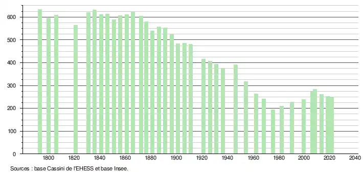 L'évolution du nombre d'habitants est connue à travers les recensements de la population effectués dans la commune depuis 1793. Pour les communes de moins de 10 000 habitants, une enquête de recensement portant sur toute la population est réalisée tous les cinq ans, les populations légales des années intermédiaires étant quant à elles estimées par interpolation ou extrapolation[26]. Pour la commune, le premier recensement exhaustif entrant dans le cadre du nouveau dispositif a été réalisé en 2008[27].