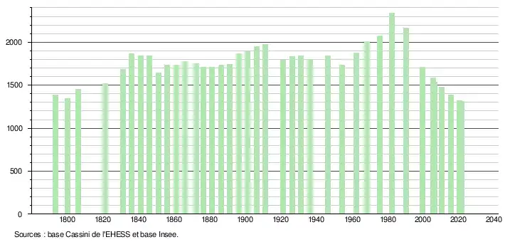 L'évolution du nombre d'habitants est connue à travers les recensements de la population effectués dans la commune depuis 1793. Pour les communes de moins de 10 000 habitants, une enquête de recensement portant sur toute la population est réalisée tous les cinq ans, les populations légales des années intermédiaires étant quant à elles estimées par interpolation ou extrapolation[33]. Pour la commune, le premier recensement exhaustif entrant dans le cadre du nouveau dispositif a été réalisé en 2005[34].