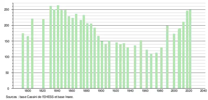 | L'évolution du nombre d'habitants est connue à travers les recensements de la population effectués dans la commune depuis 1793. Pour les communes de moins de 10 000 habitants, une enquête de recensement portant sur toute la population est réalisée tous les cinq ans, les populations légales des années intermédiaires étant quant à elles estimées par interpolation ou extrapolation[27]. Pour la commune, le premier recensement exhaustif entrant dans le cadre du nouveau dispositif a été réalisé en 2007[28]. En 2021, la commune comptait 249 habitants[Note 5], en augmentation de 8,73 % par rapport à 2015 (Aude : +2,47 %, France hors Mayotte : +1,84 %). |
