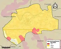 Le retrait-gonflement des sols argileux est susceptible d'engendrer des dommages importants aux bâtiments en cas d’alternance de périodes de sécheresse et de pluie. 96,9 % de la superficie communale est en aléa moyen ou fort (75,2 % au niveau départemental et 48,5 % au niveau national). Sur les 622 bâtiments dénombrés sur la commune en 2019, 622 sont en aléa moyen ou fort, soit 100 %, à comparer aux 94 % au niveau départemental et 54 % au niveau national. Une cartographie de l'exposition du territoire national au retrait gonflement des sols argileux est disponible sur le site du BRGM[24],[Carte 3].