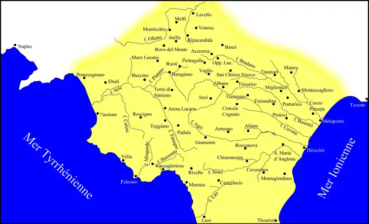 Sur la côte ouest se trouvait la ville de Poseidonia, conquise par les Lucaniens vers 430 av. J.-C., connue par la suite sous le nom Paestum (reprenant l'hypothétique nom osque de Phaiston) après qu'une colonie romaine y ait été déduite en 272 av. J.-C. ; en dessous se trouvaient Élée (Vélia à l'époque romaine), Pyxous (Policastro Bussentino), appelée par les Romains Buxentum, ainsi que Laüs, autrement appelée Laos, colonie grecque fondée par des survivants, à la suite de la destruction de Sybaris par Crotone, et conquise par les Lucaniens au début du IVe siècle probablement.