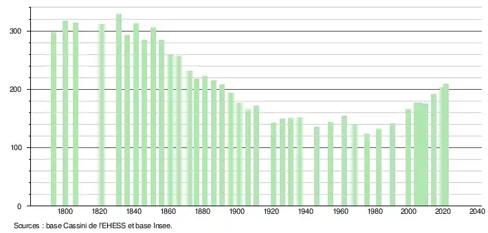 L'évolution du nombre d'habitants est connue à travers les recensements de la population effectués dans la commune depuis 1793. Pour les communes de moins de 10 000 habitants, une enquête de recensement portant sur toute la population est réalisée tous les cinq ans, les populations légales des années intermédiaires étant quant à elles estimées par interpolation ou extrapolation[20]. Pour la commune, le premier recensement exhaustif entrant dans le cadre du nouveau dispositif a été réalisé en 2004[21].