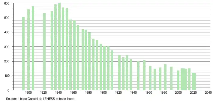 L'évolution du nombre d'habitants est connue à travers les recensements de la population effectués dans la commune depuis 1793. Pour les communes de moins de 10 000 habitants, une enquête de recensement portant sur toute la population est réalisée tous les cinq ans, les populations légales des années intermédiaires étant quant à elles estimées par interpolation ou extrapolation[24]. Pour la commune, le premier recensement exhaustif entrant dans le cadre du nouveau dispositif a été réalisé en 2004[25].