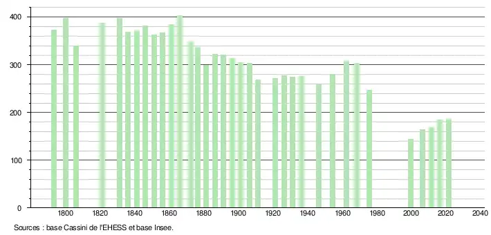 L'évolution du nombre d'habitants est connue à travers les recensements de la population effectués dans la commune depuis 1793. Pour les communes de moins de 10 000 habitants, une enquête de recensement portant sur toute la population est réalisée tous les cinq ans, les populations légales des années intermédiaires étant quant à elles estimées par interpolation ou extrapolation[17]. Pour la commune, le premier recensement exhaustif entrant dans le cadre du nouveau dispositif a été réalisé en 2006[18].