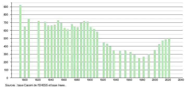 L'évolution du nombre d'habitants est connue à travers les recensements de la population effectués dans la commune depuis 1793. Pour les communes de moins de 10 000 habitants, une enquête de recensement portant sur toute la population est réalisée tous les cinq ans, les populations légales des années intermédiaires étant quant à elles estimées par interpolation ou extrapolation[22]. Pour la commune, le premier recensement exhaustif entrant dans le cadre du nouveau dispositif a été réalisé en 2006[23].