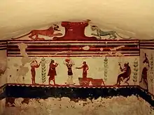 Les fresques des tombes étrusques représentent des scènes où la musique occupe une place primordiale ainsi que les jeux funéraires qui nous sont connus (Nécropole de Monterozzi).