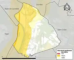 Le retrait-gonflement des sols argileux est susceptible d'engendrer des dommages importants aux bâtiments en cas d’alternance de périodes de sécheresse et de pluie. 44,5 % de la superficie communale est en aléa moyen ou fort (44,5 % au niveau départemental et 48,5 % au niveau national). Sur les 73 bâtiments dénombrés sur la commune en 2019, 35 sont en aléa moyen ou fort, soit 48 %, à comparer aux 75 % au niveau départemental et 54 % au niveau national. Une cartographie de l'exposition du territoire national au retrait gonflement des sols argileux est disponible sur le site du BRGM[29],[Carte 3].
