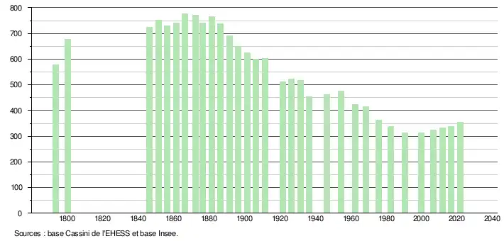 L'évolution du nombre d'habitants est connue à travers les recensements de la population effectués dans la commune depuis 1793. Pour les communes de moins de 10 000 habitants, une enquête de recensement portant sur toute la population est réalisée tous les cinq ans, les populations légales des années intermédiaires étant quant à elles estimées par interpolation ou extrapolation[42]. Pour la commune, le premier recensement exhaustif entrant dans le cadre du nouveau dispositif a été réalisé en 2006[43].