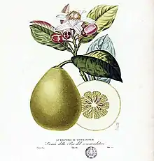La pomme d'Adam - fruit rond, non pyriforme - est classée dans le bigarades par Risso[24] et par Gallesio[25], pour certains modernes c'est un citron[26], ou une mutation de Poire du Commandeur[27]..