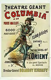Avant cela, pour l'ouverture de l'Exposition universelle de 1900, une salle de 6 000 places, nommée « le Columbia », fut construite pour abriter un spectacle de 1 500 personnages dont 600 danseuses et toute une ménagerie de serpents, éléphants, chameaux et chevaux. « Entre la rampe et les premières rangées de spectateurs s'étend un lac où naviguent des escadres »[2].
