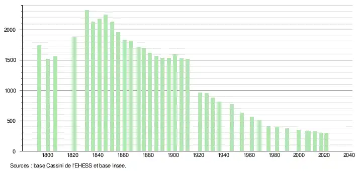 L'évolution du nombre d'habitants est connue à travers les recensements de la population effectués dans la commune depuis 1793. Pour les communes de moins de 10 000 habitants, une enquête de recensement portant sur toute la population est réalisée tous les cinq ans, les populations légales des années intermédiaires étant quant à elles estimées par interpolation ou extrapolation[21]. Pour la commune, le premier recensement exhaustif entrant dans le cadre du nouveau dispositif a été réalisé en 2007[22].