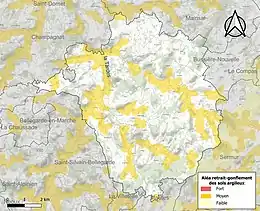 Le retrait-gonflement des sols argileux est susceptible d'engendrer des dommages importants aux bâtiments en cas d’alternance de périodes de sécheresse et de pluie. 24,9 % de la superficie communale est en aléa moyen ou fort (33,6 % au niveau départemental et 48,5 % au niveau national). Sur les 299 bâtiments dénombrés sur la commune en 2019, 81 sont en aléa moyen ou fort, soit 27 %, à comparer aux 25 % au niveau départemental et 54 % au niveau national. Une cartographie de l'exposition du territoire national au retrait gonflement des sols argileux est disponible sur le site du BRGM[15],[Carte 2].
