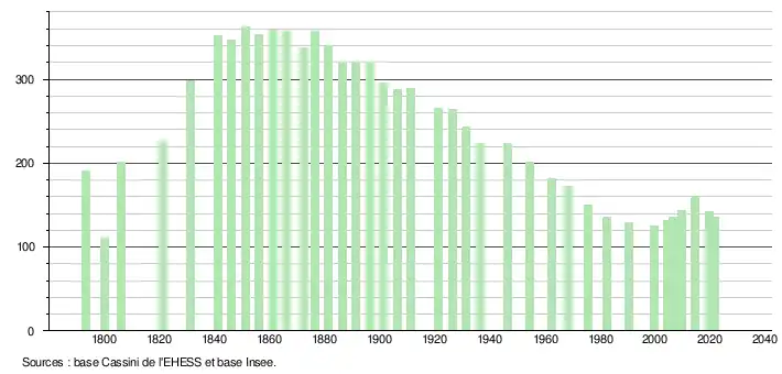 L'évolution du nombre d'habitants est connue à travers les recensements de la population effectués dans la commune depuis 1793. Pour les communes de moins de 10 000 habitants, une enquête de recensement portant sur toute la population est réalisée tous les cinq ans, les populations légales des années intermédiaires étant quant à elles estimées par interpolation ou extrapolation[24]. Pour la commune, le premier recensement exhaustif entrant dans le cadre du nouveau dispositif a été réalisé en 2004[25].