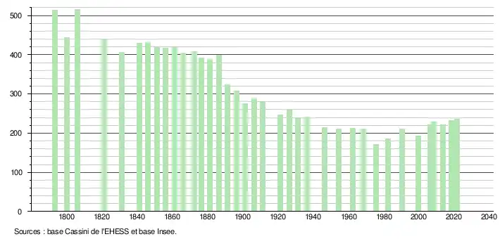 L'évolution du nombre d'habitants est connue à travers les recensements de la population effectués dans la commune depuis 1793. Pour les communes de moins de 10 000 habitants, une enquête de recensement portant sur toute la population est réalisée tous les cinq ans, les populations légales des années intermédiaires étant quant à elles estimées par interpolation ou extrapolation[24]. Pour la commune, le premier recensement exhaustif entrant dans le cadre du nouveau dispositif a été réalisé en 2008[25].