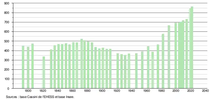 L'évolution du nombre d'habitants est connue à travers les recensements de la population effectués dans la commune depuis 1793. Pour les communes de moins de 10 000 habitants, une enquête de recensement portant sur toute la population est réalisée tous les cinq ans, les populations légales des années intermédiaires étant quant à elles estimées par interpolation ou extrapolation[29]. Pour la commune, le premier recensement exhaustif entrant dans le cadre du nouveau dispositif a été réalisé en 2004[30].
