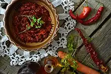 - Matbukha : salade de tomates et de poivrons cuits originaire du Maghreb et répandue au Proche-Orient