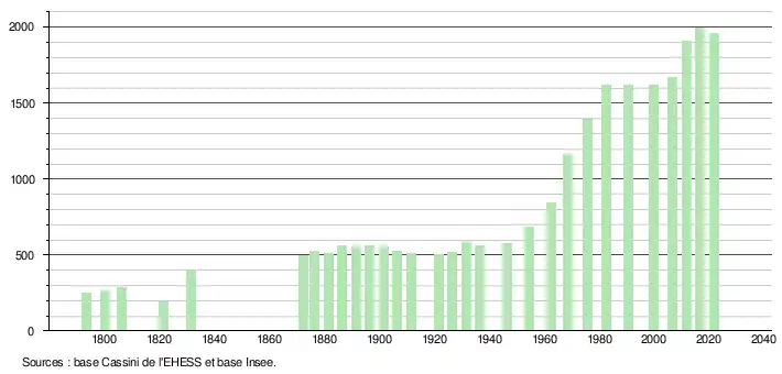 L'évolution du nombre d'habitants est connue à travers les recensements de la population effectués dans la commune depuis 1793. Pour les communes de moins de 10 000 habitants, une enquête de recensement portant sur toute la population est réalisée tous les cinq ans, les populations légales des années intermédiaires étant quant à elles estimées par interpolation ou extrapolation[21]. Pour la commune, le premier recensement exhaustif entrant dans le cadre du nouveau dispositif a été réalisé en 2006[22].