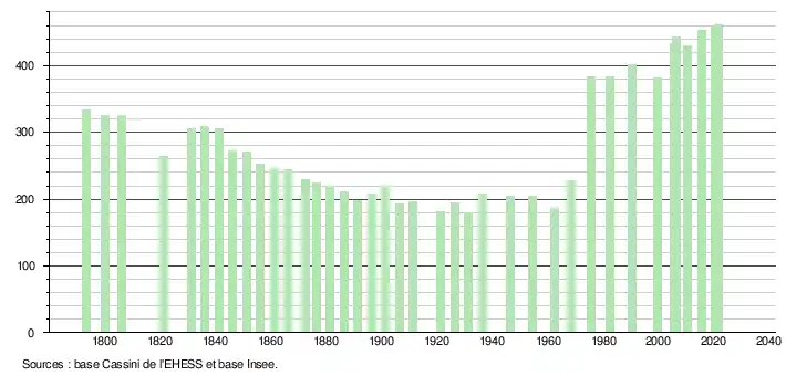 L'évolution du nombre d'habitants est connue à travers les recensements de la population effectués dans la commune depuis 1793. Pour les communes de moins de 10 000 habitants, une enquête de recensement portant sur toute la population est réalisée tous les cinq ans, les populations légales des années intermédiaires étant quant à elles estimées par interpolation ou extrapolation[24]. Pour la commune, le premier recensement exhaustif entrant dans le cadre du nouveau dispositif a été réalisé en 2005[25].