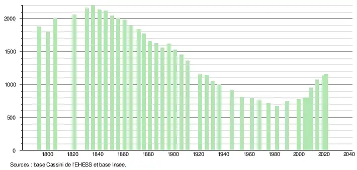 L'évolution du nombre d'habitants est connue à travers les recensements de la population effectués dans la commune depuis 1793. Pour les communes de moins de 10 000 habitants, une enquête de recensement portant sur toute la population est réalisée tous les cinq ans, les populations légales des années intermédiaires étant quant à elles estimées par interpolation ou extrapolation[35]. Pour la commune, le premier recensement exhaustif entrant dans le cadre du nouveau dispositif a été réalisé en 2004[36].