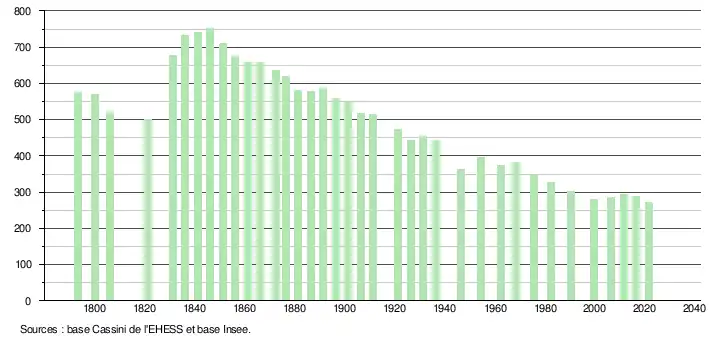 L'évolution du nombre d'habitants est connue à travers les recensements de la population effectués dans la commune depuis 1793. Pour les communes de moins de 10 000 habitants, une enquête de recensement portant sur toute la population est réalisée tous les cinq ans, les populations légales des années intermédiaires étant quant à elles estimées par interpolation ou extrapolation[24]. Pour la commune, le premier recensement exhaustif entrant dans le cadre du nouveau dispositif a été réalisé en 2006[25].