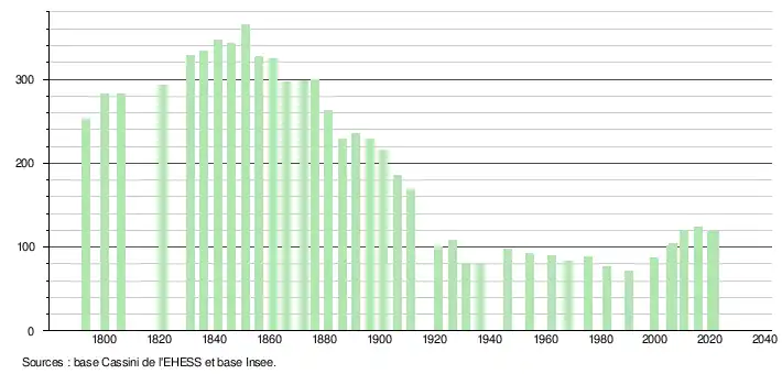 L'évolution du nombre d'habitants est connue à travers les recensements de la population effectués dans la commune depuis 1793. Pour les communes de moins de 10 000 habitants, une enquête de recensement portant sur toute la population est réalisée tous les cinq ans, les populations légales des années intermédiaires étant quant à elles estimées par interpolation ou extrapolation[20]. Pour la commune, le premier recensement exhaustif entrant dans le cadre du nouveau dispositif a été réalisé en 2005[21].