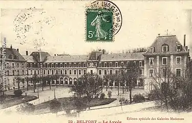 Le lycée est donc né de la guerre, et de la volonté des familles alsaciennes d'offrir à leurs enfants un enseignement en français, et en France. Une souscription lancée à l'initiative d'Alfred Koechlin-Schwartz, industriel alsacien établi à Belfort a permis de recueillir 100 000 francs pour la construction du lycée de Belfort[19]. Par décret du ministère de l'Instruction publique, le lycée sera appelé "lycée national"[20].