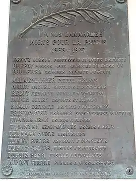 Dès 1899, l'Association Amicale des anciens élèves et du souvenir français installe des plaques commémoratives d'anciens élèves morts au combat.