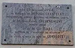 La dénomination même du lycée témoigne de l'originalité de son histoire : "lycée de Belfort" quand il est créé de façon unique en son genre, puis "lycée national" par décision ministérielle, et "lycée de garçons" traditionnellement à Belfort, on l’appelle "lycée Roosevelt" lorsqu'il devient mixte (du nom de la rue où il est situé), et enfin "lycée Condorcet" en 1994[59]. Une cérémonie est organisée à cette occasion en présence du député-maire de Belfort, Jean-Pierre Chevènement et du recteur, Guy Isaac.