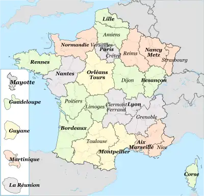 France : Régions et circonscriptions académiques (hors vice-rectorats) au .