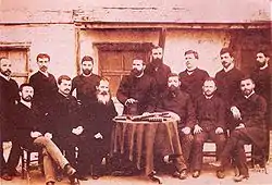 Elèves, deuxième rang: Nikola Zarzev, Konstantin Robev (bg), Nikola Apostolov (bg), Pantcho Vaskov (bg), Dimităr Poptomov (bg), Yakim Ignatiev (bg), Ivan Hadjimichev, Manassi Dimitrov (bg)