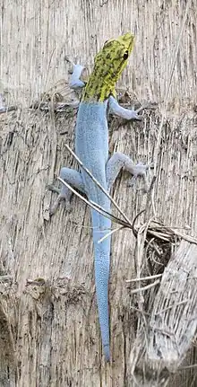 C'est un gecko diurne et arboricole d'apparence assez svelte. La couleur dominante est le gris-bleu sur tout le corps, avec des lignes longitudinales un peu plus sombres, plus marquées sur la tête. Cette dernière est généralement plus claire, et jaune selon les individus.