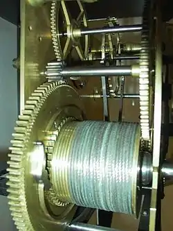 - le diamètre autour duquel s'enroule la corde doit être compatible avec l'effort à transmettre au rouage : dans les premières horloges d'édifices, les frottements à vaincre étaient importants, d'où des poids de plusieurs dizaines ou même de centaines de kilogrammes[2] enroulés sur des tambours de fort diamètre ;