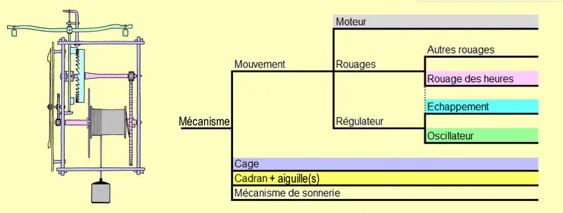 Ce mécanisme résulte d'un assemblage mécanique de pièces dont certaines peuvent avoir un mouvement par rapport aux autres. Désigné comme mécanisme primaire, il comprend alors d'autres mécanismes plus élémentaires, de niveaux inférieurs, tels l'élément moteur, le rouage, l'échappement, etc.