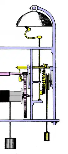 - le moteur : dispositif qui transforme l'énergie emmagasinée d'un poids ou d'un ressort en un mouvement « non uniforme » mais nécessaire au système ;