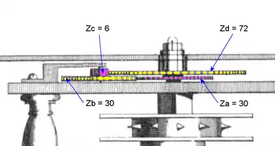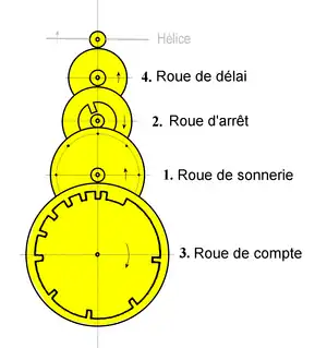 Les rouages sont des trains d'engrenages transmettant le couple moteur et le mouvement de l'organe moteur vers d'autres éléments du mécanisme[12].