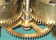 - les rouages : ensemble d'engrenages transmettant le couple moteur et le mouvement de l'organe moteur vers les autres éléments du système. On peut distinguer :