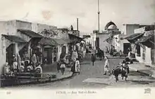 Carte postale ancienne montrant la rue Sidi El Béchir : la médersa est coiffée de deux coupoles