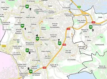 Il comprend une médiathèque centrale, située dans le quartier de Tarentaize, six annexes et deux bibliobus. Les médiathèques municipales de Saint-Étienne proposent plus de 527 000 documents, dont plus de 378 000 en libre accès. Le réseau accueille près de 15 000 inscrits et enregistre près d'un million de prêts d'ouvrages chaque année[1].