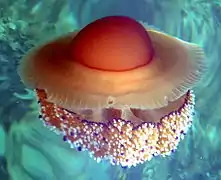 Les battements continus de l'ombrelle contractile permettent aux méduses de flotter et de se propulser. Les contractions des myofibrilles (cellules myoépithéliales endodermiques et ectodermiques) formant une nappe sous-ombrellaire accentuent la convexité de l'ombrelle et provoquent l'éjection d'eau. Le retour à la position de repos est passif et est dû à l'élasticité de la mésoglée. Lorsque les méduses se dirigent activement vers le fond, elle se retournent, l'ex-ombrelle vers le bas, de telle façon que l'éjection d'eau vers le haut assure la propulsion vers le bas. L'intensité du déplacement est liée à la puissance de la contraction de la sous-ombrelle et au degré d'occlusion du velum. Les vitesses obtenues par ce jet-propulsion varient généralement entre 5 et 15 cm par seconde[52],[53]. Les mouvements natatoires restent généralement lents et peu prolongés, les méduses se laissant généralement entraîner par les courants et faisant partie du macroplancton[54].