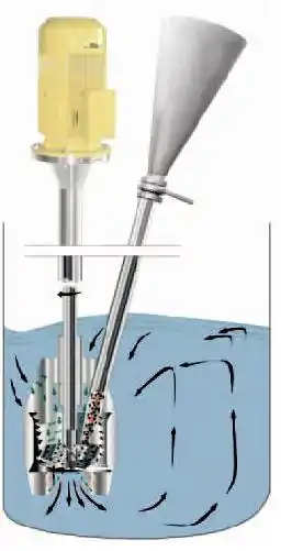 Le bipasse est un tube d'incorporation qui peut être ajouté au mélangeur à jet axial pour introduire des poudres (schéma ci-dessus). La tête de mélange en forme de venturi crée une forte dépression. Le bipasse est placé juste au-dessus de la tête de mélange, ce qui permet aux poudres d'être aspirées par la dépression. Les poudres sont aspirées sous le niveau du liquide, ce qui évite les risques de flottaison et donc les formations de grumeaux.