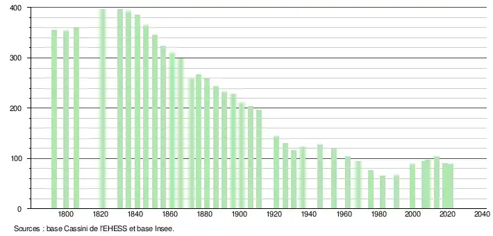 L'évolution du nombre d'habitants est connue à travers les recensements de la population effectués dans la commune depuis 1793. Pour les communes de moins de 10 000 habitants, une enquête de recensement portant sur toute la population est réalisée tous les cinq ans, les populations légales des années intermédiaires étant quant à elles estimées par interpolation ou extrapolation[15]. Pour la commune, le premier recensement exhaustif entrant dans le cadre du nouveau dispositif a été réalisé en 2008[16].